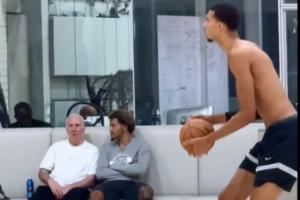 心念爱徒!波波维奇场边与索汉并坐 观看文班亚马投篮训练
