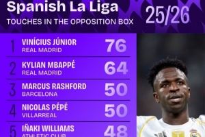 体育资讯10月7日讯 日前,Squawka统计了本赛季西甲禁区触球次数排行,维尼修斯76次居首,姆巴佩64次第二。