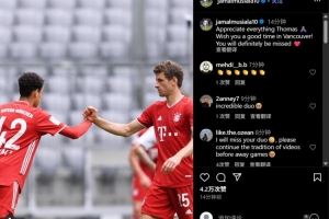 穆西亚拉社媒写道:感谢你所做的一切托马斯祝你在温哥华一切顺利,一定会想念你的❤️